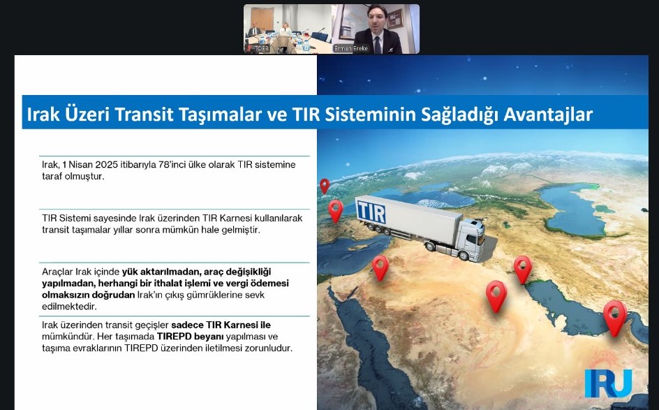 Irak’ın 1 Nisan 2025 tarihi itibarıyla TIR Sistemini transit taşımalarda hayata geçmesiyle Irak üzerinden Körfez ülkelerine karayolu ile taşımalar başladı. Taşımaların başlaması akabinde yaşanan gelişmeler üzerine TOBB Taşıma ve Lojistik Sistemler Dairesi TIR İşlemleri Müdürlüğü ve Uluslararası Karayolu Taşımacılığı Birliği (IRU) iş birliğinde, dün bir webinar düzenlendi.