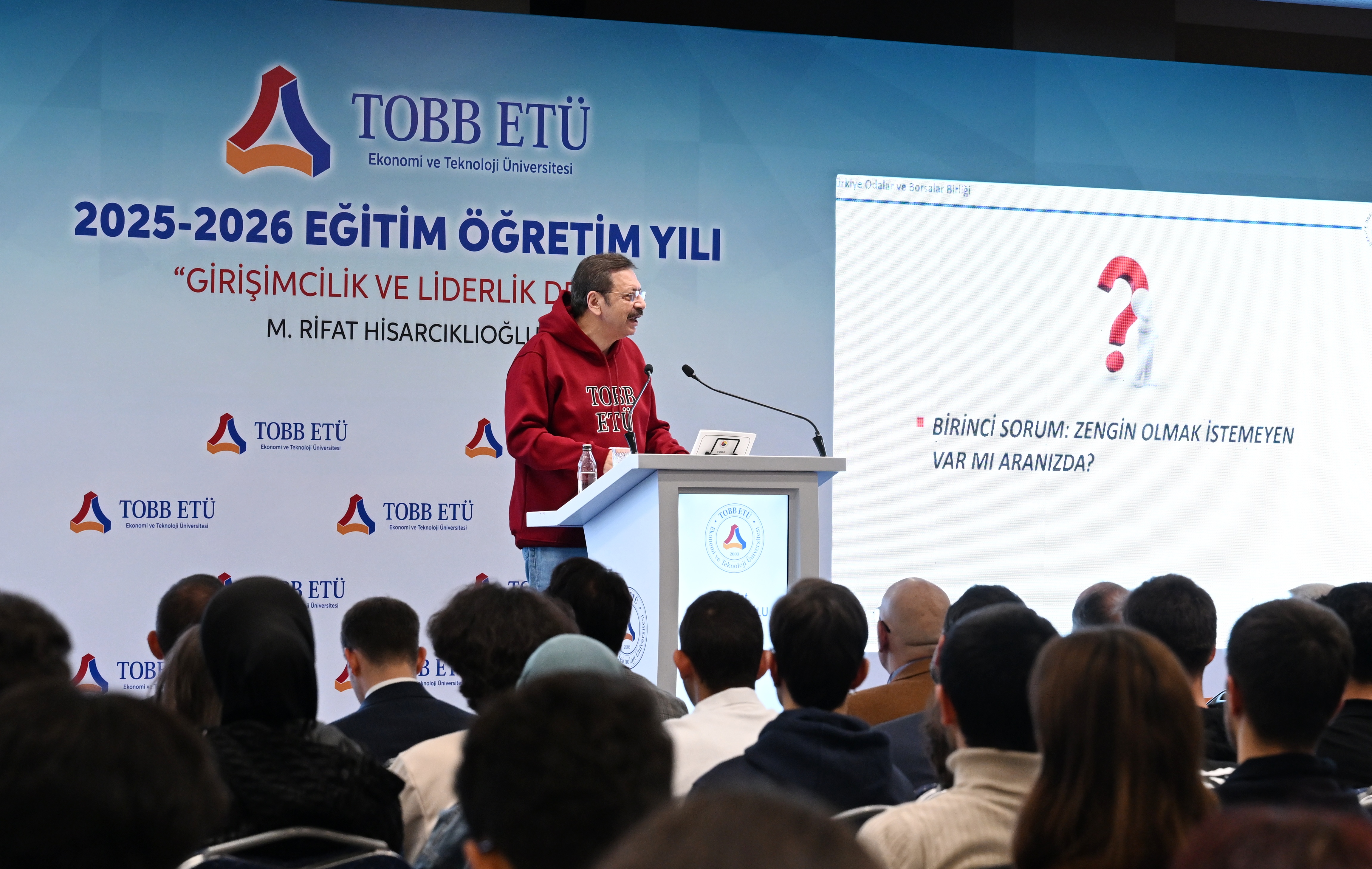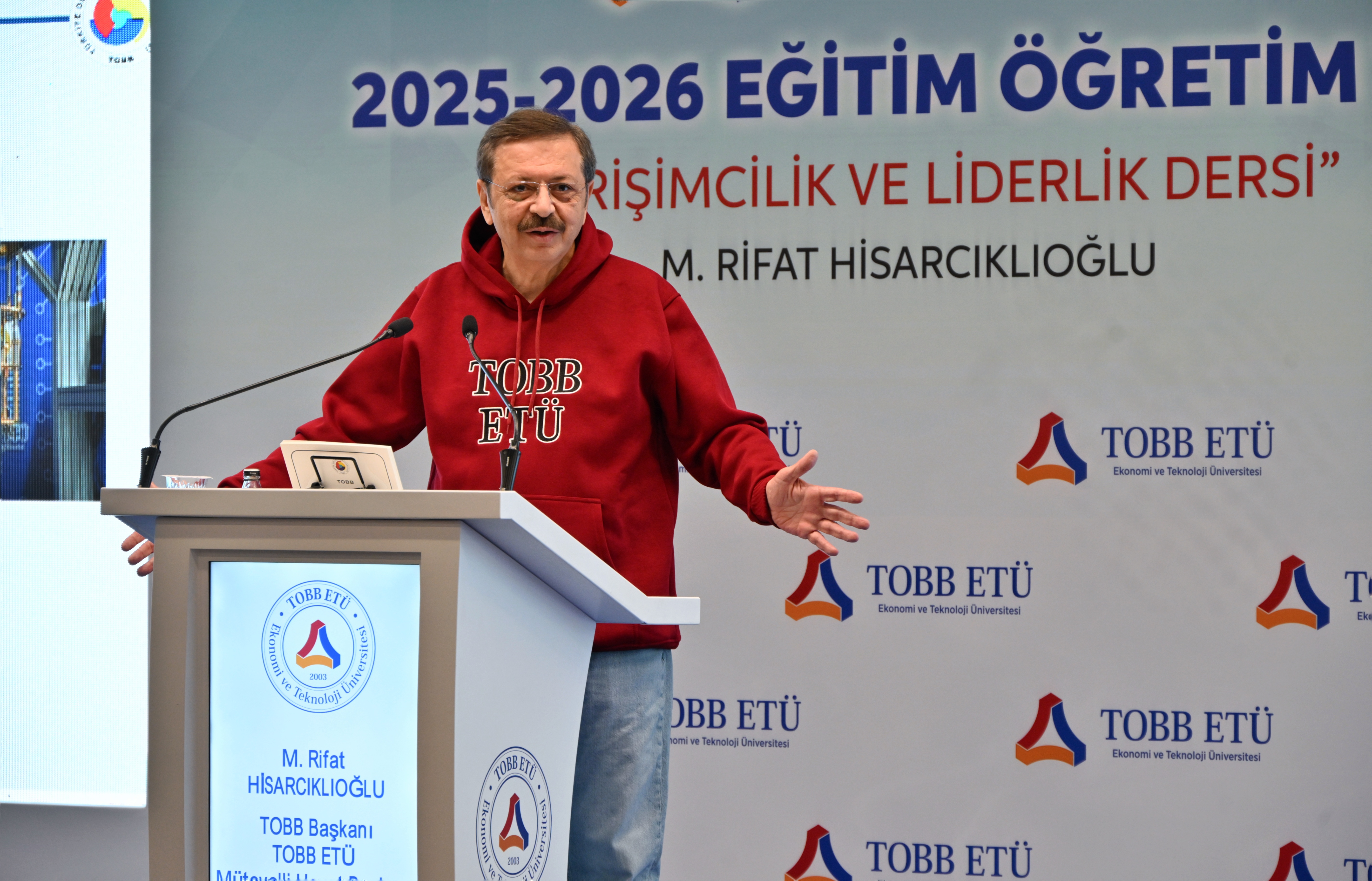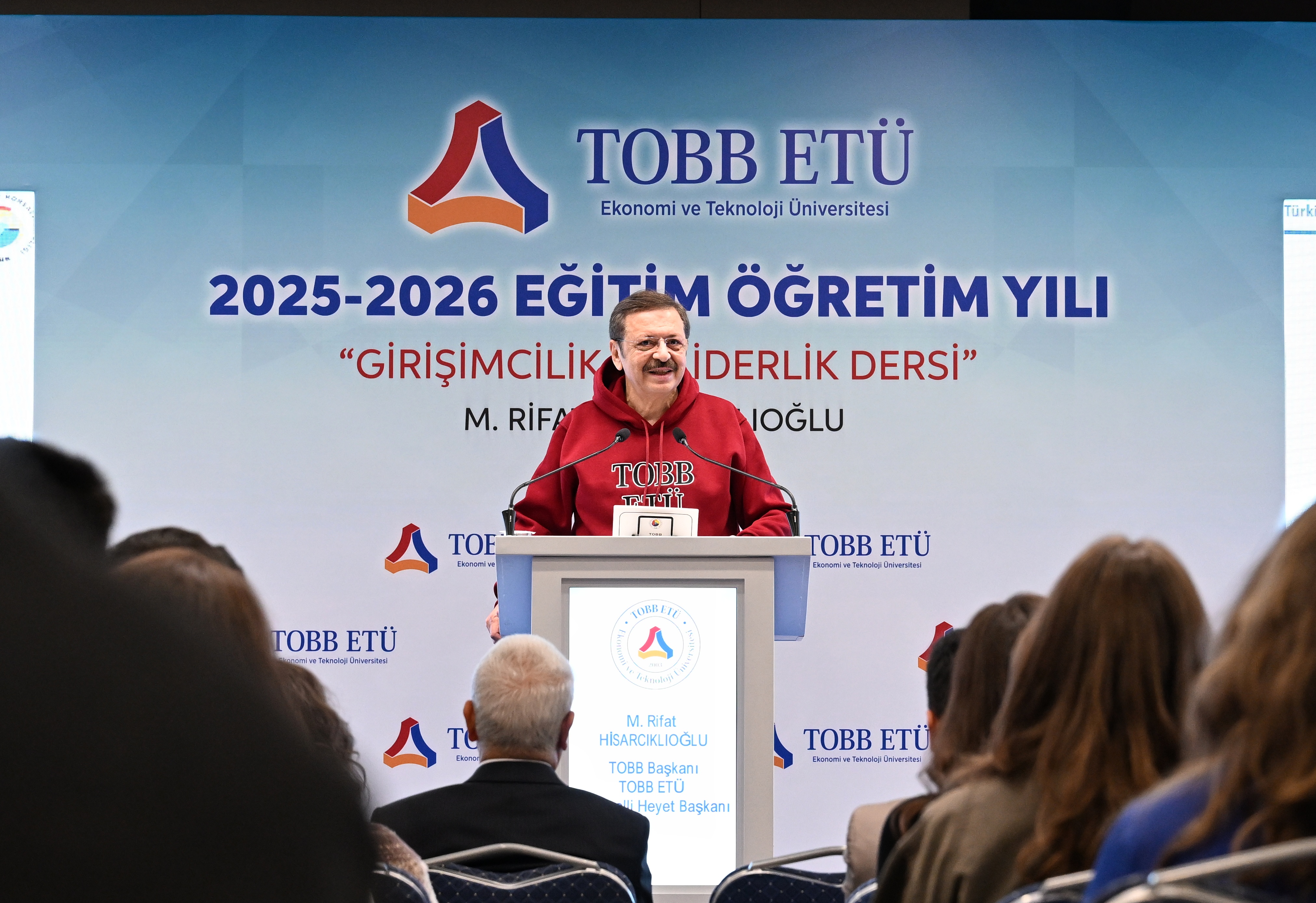 Öğrencilere girişimcilik ve liderlik konusunda görüşlerini aktaran TOBB Başkanı ve TOBB ETÜ Mütevelli Heyeti Başkanı M. Rifat Hisarcıklıoğlu, girişimcilik için öncelikle paraya değil, iyi bir fikre ve çok çalışmaya ihtiyaç olduğunu vurguladı. Yenidünyada girişimci olmak için gerekenleri; hayal kurmak, hedef koymak, çok çalışmak, yenilikçi olmak, değişim getirmek, ortaklık kültürüne değer vermek, iyi bir takım oluşturmak ve kaybettiğinde pes etmemek olarak açıklayan Hisarcıklıoğlu, yola çıkarken herkese ilkeleri olmasını tavsiye etti. Kendi ilkelerini: “İşten Artmaz, Dişten Artar",