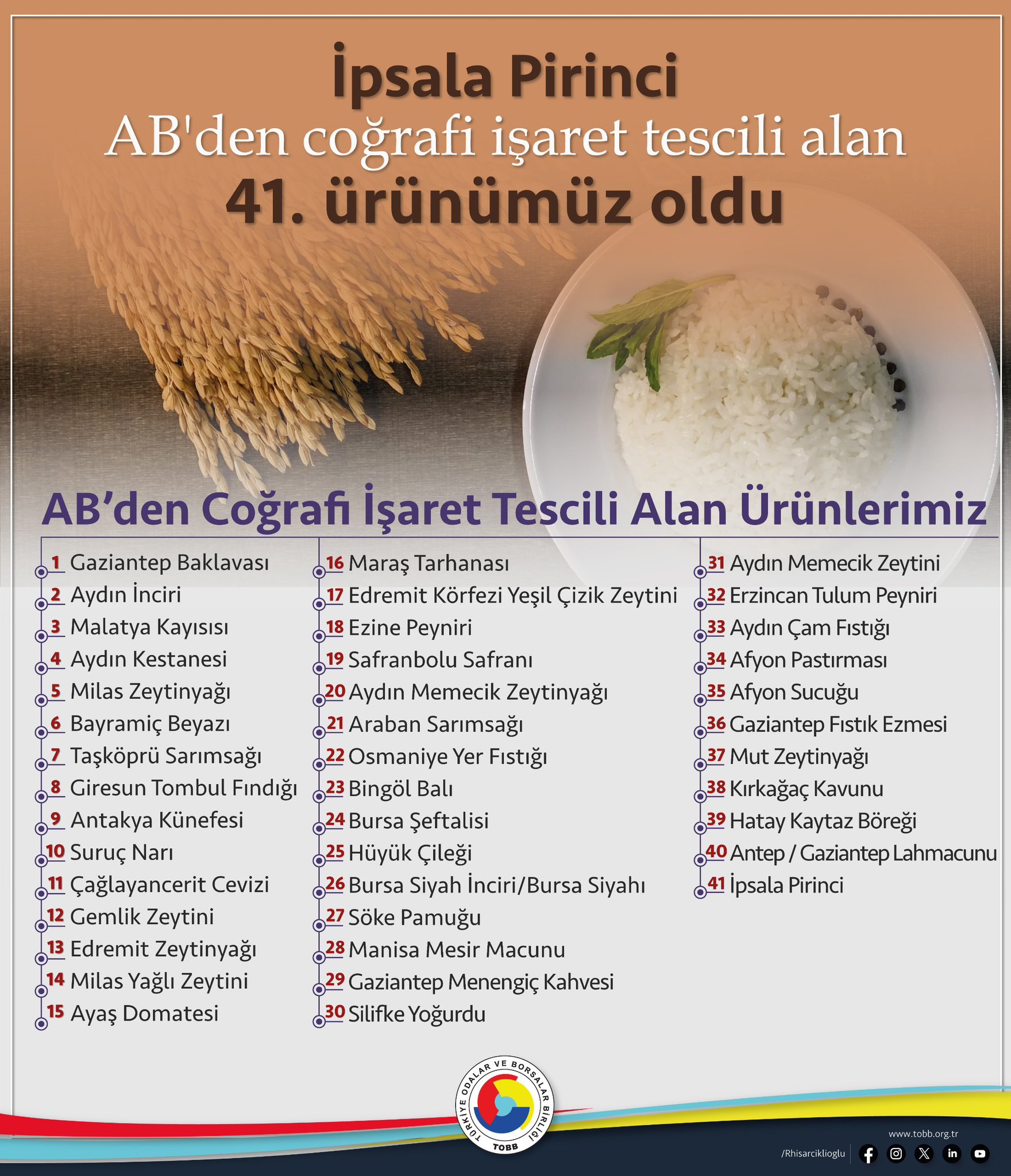 Hisarcıklıoğlu konuya ilişkin açıklamasında, “İpsala Pirinci, Avrupa Birliği’nden coğrafi işaret tescili alan 41. ürünümüz oldu. Edirne’ye ve ülkemize hayırlı olsun. Yerel değerlerimize sahip çıkan Keşan Ticaret ve Sanayi Odası Başkanımız İsmail Şapçı’yı, Keşan TSO Yönetim Kurulunu, Meclisini ve emeği geçen herkesi kutluyorum. Dünyada çok az coğrafyaya nasip olan bir ürün çeşitliliğine sahibiz. TOBB ve Oda-Borsa camiası olarak yerel ve coğrafi işaretli ürünler için yoğun çaba sarf ediyoruz. Avrupa Birliği süreci devam eden 41 coğrafi işaret ve 2 geleneksel ürün adı ile ilgili çalışmalarımız devam ediyor” dedi.
