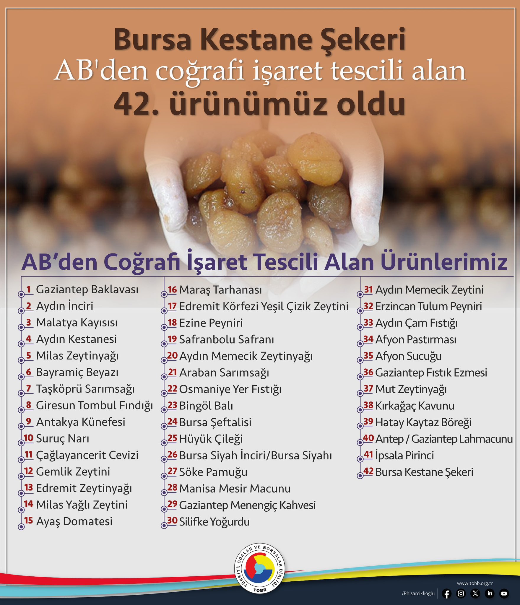 Hisarcıklıoğlu konuya ilişkin açıklamasında, “Bursa Kestane Şekeri, Avrupa Birliği’nden coğrafi işaret tescili alan 42. ürünümüz oldu. Bursa’ya ve ülkemize hayırlı olsun. Yerel değerlerimize sahip çıkan Bursa Ticaret ve Sanayi Odası Başkanımız İbrahim Burkay’ı, Bursa TSO Yönetim Kurulunu, Meclisini ve emeği geçen herkesi kutluyorum. Dünyada çok az coğrafyaya nasip olan bir ürün çeşitliliğine sahibiz. TOBB ve Oda-Borsa camiası olarak yerel ve coğrafi işaretli ürünler için yoğun çaba sarf ediyoruz. Avrupa Birliği süreci devam eden 40 coğrafi işaret ve 2 geleneksel ürün adı ile ilgili çalışmalarımız devam ediyor” dedi.