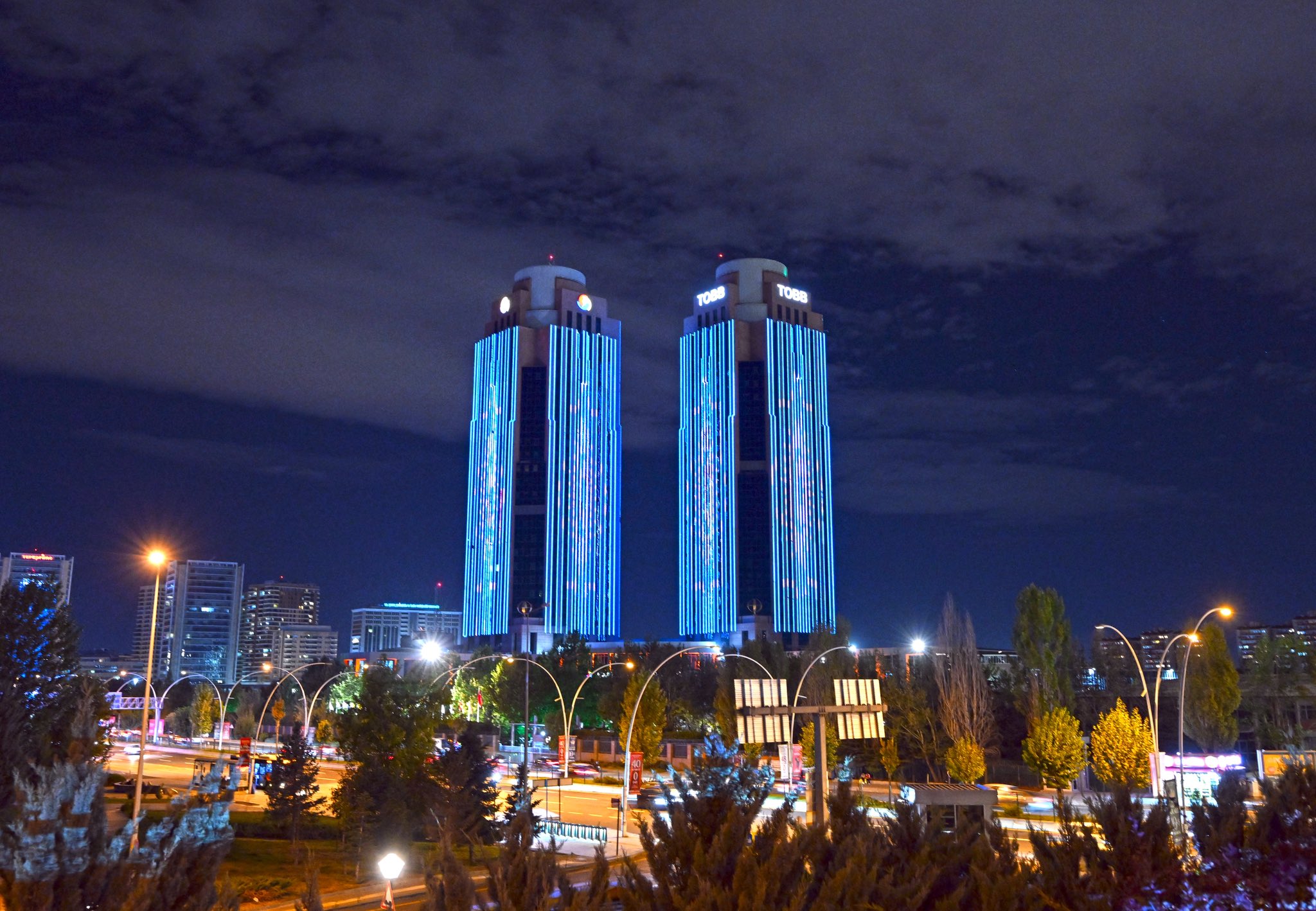 Türkiye Odalar ve Borsalar Birliği (TOBB) İkiz Kuleler, 3 Ekim Türk Devletleri İşbirliği Günü nedeniyle Türk Devletleri Teşkilatı bayrağı renkleriyle ışıklandırıldı.