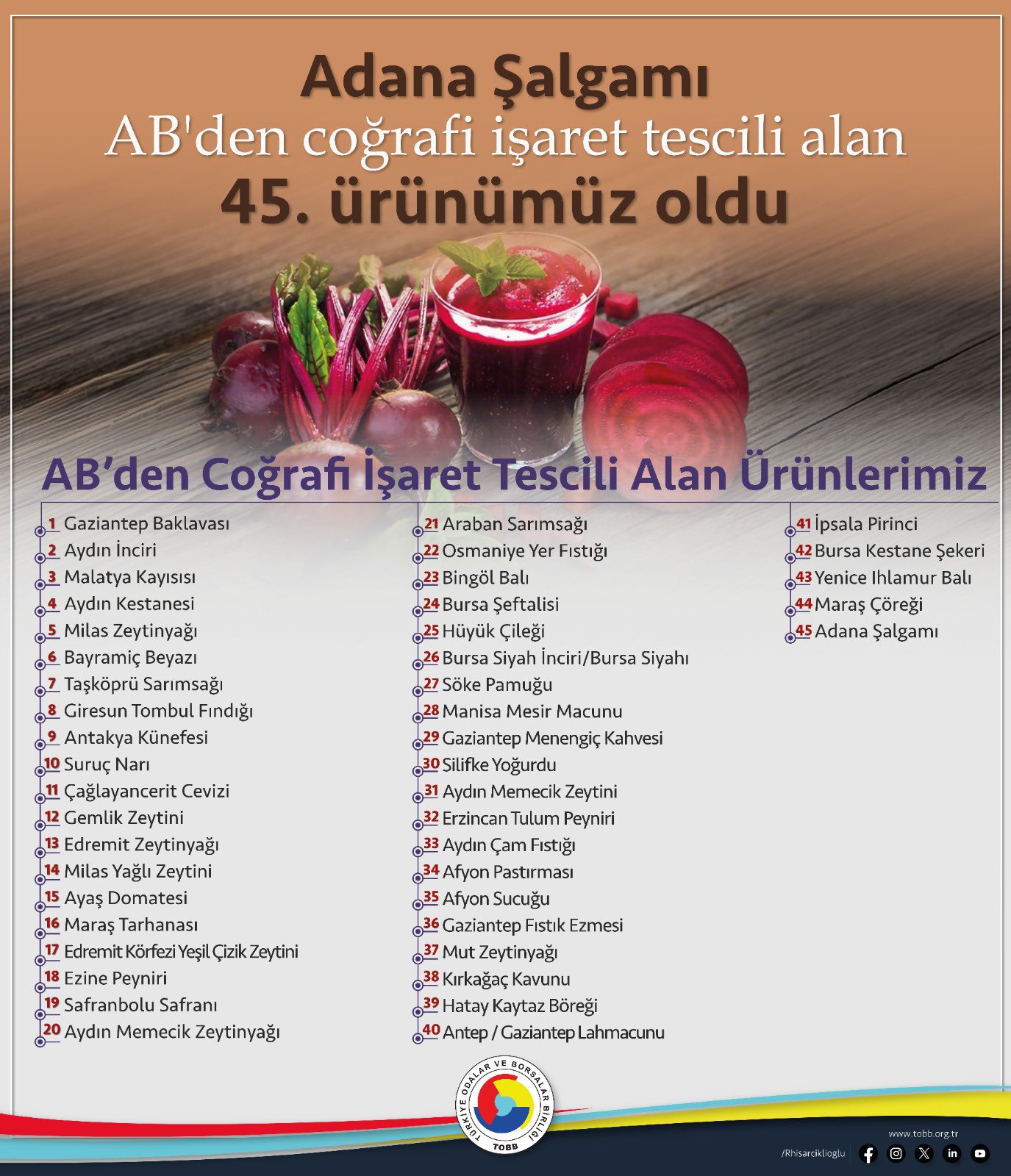 Hisarcıklıoğlu konuya ilişkin açıklamasında, “Adana Şalgamı, Avrupa Birliği’nden coğrafi işaret tescili alan 45. ürünümüz oldu. Adana’ya ve ülkemize hayırlı olsun. Yerel değerlerimize sahip çıkan Adana Ticaret Odası Başkanımız Yücel Bayram’ı, Adana Ticaret Odası Yönetim Kurulunu, Meclisini ve emeği geçen herkesi kutluyorum. Dünyada çok az coğrafyaya nasip olan bir ürün çeşitliliğine sahibiz. TOBB ve Oda-Borsa camiası olarak yerel ve coğrafi işaretli ürünler için yoğun çaba sarf ediyoruz. Avrupa Birliği süreci devam eden 46 coğrafi işaret ve 2 geleneksel ürün adı ile ilgili çalışmalarımız devam ediyor” ifadelerini kullandı.
