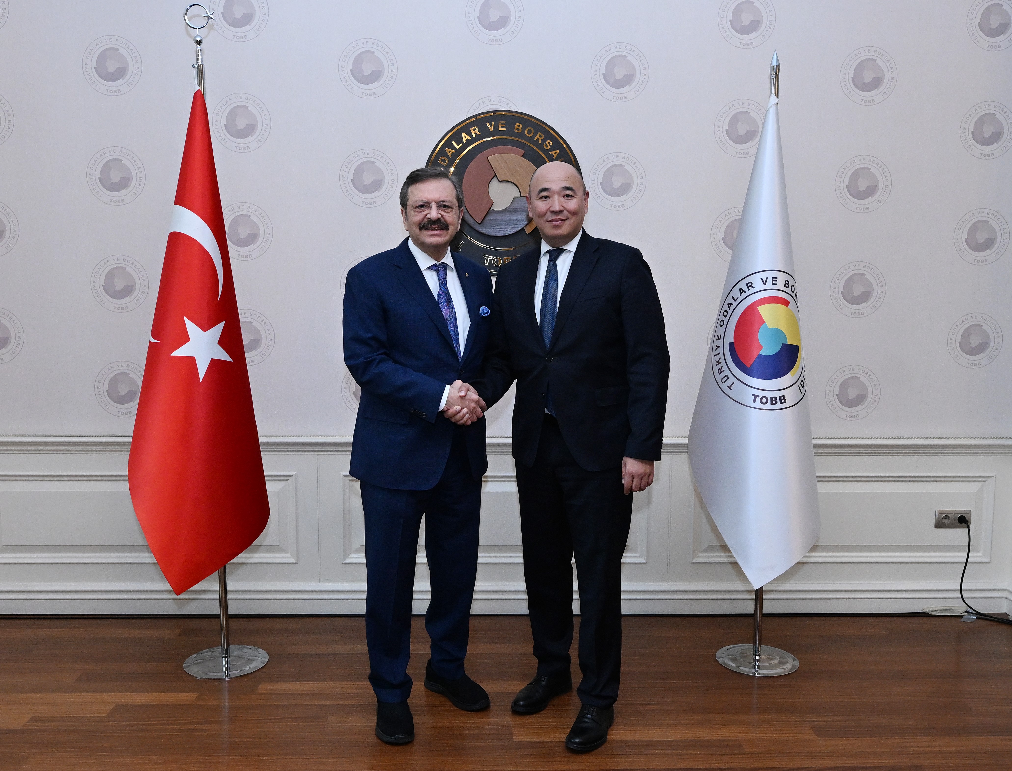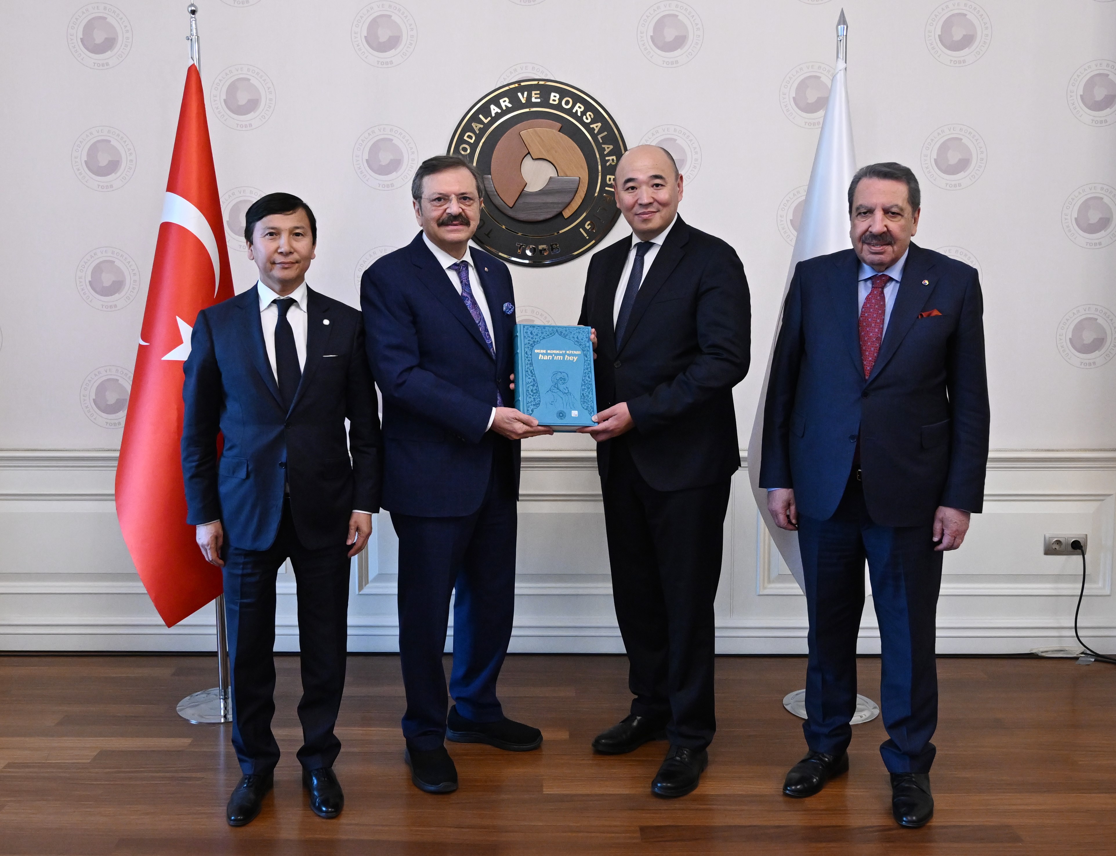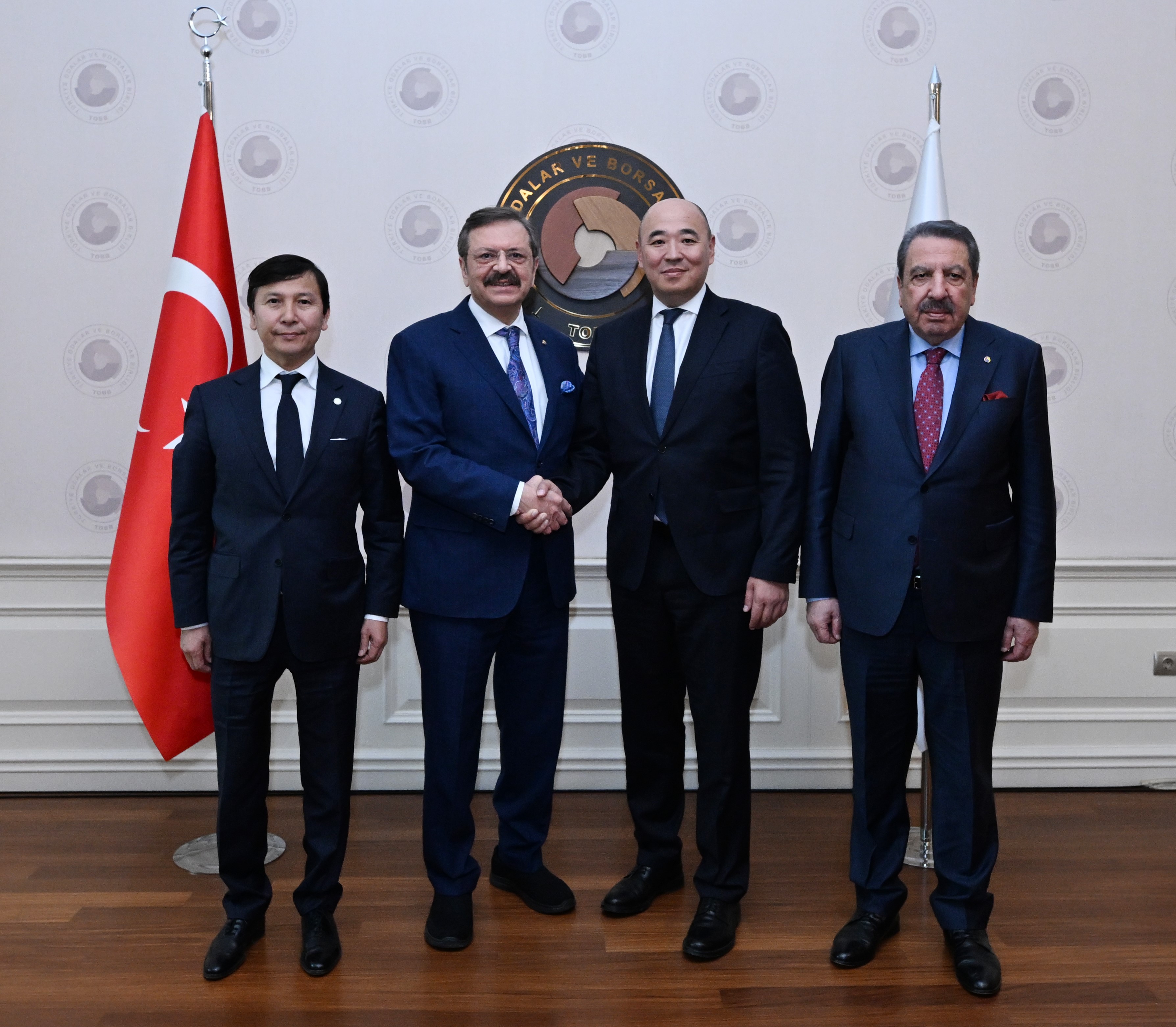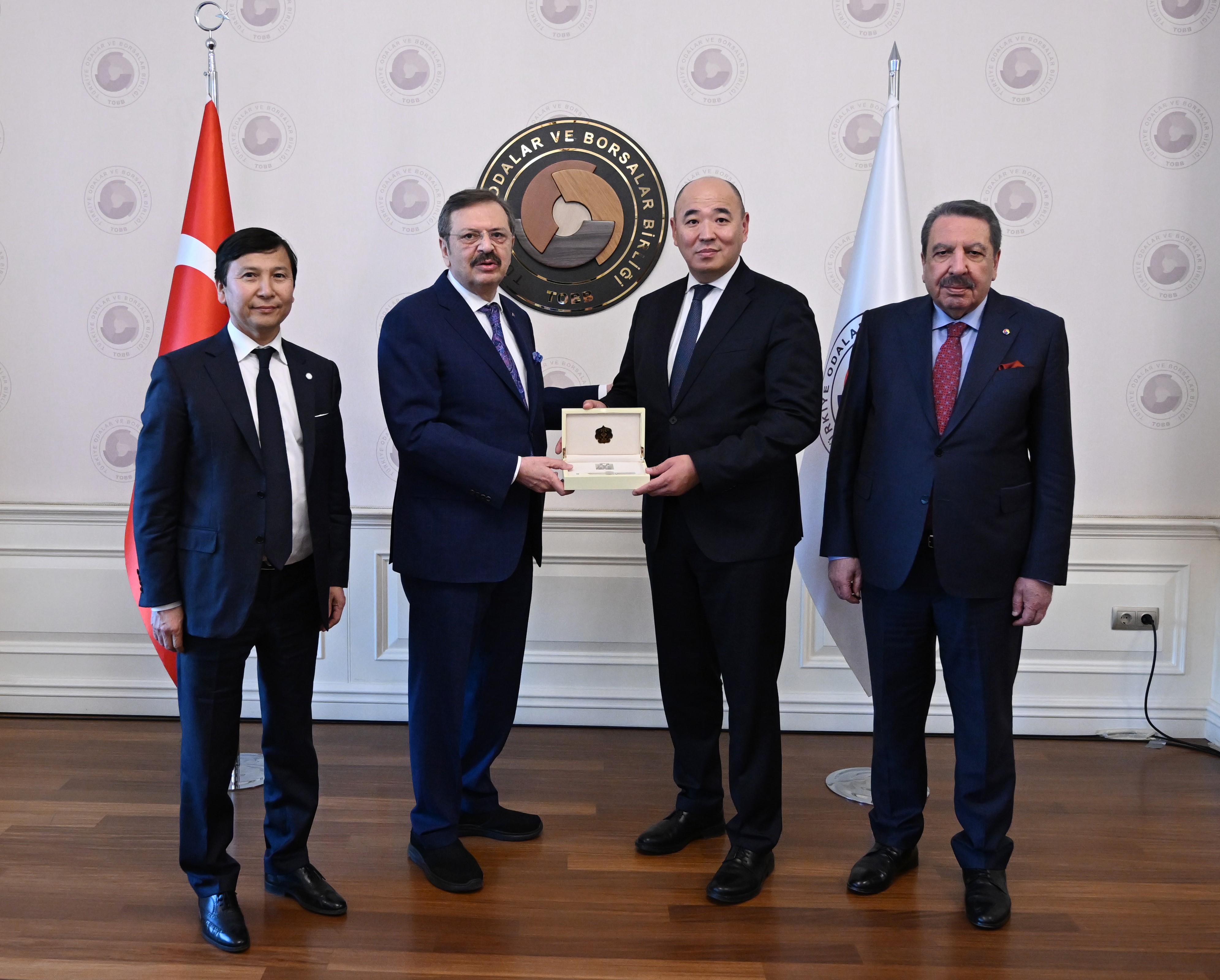 Türkiye Odalar ve Borsalar Birliği (TOBB) Başkanı M. Rifat Hisarcıklıoğlu, Kazakistan Ulusal Girişimciler Odası (ATAMEKEN) Başkanı Kanat Şarlapayev ve Kazakistan'ın Ankara Büyükelçisi Yerkebulan Sapiyev’i TOBB İkiz Kuleler’de ağırladı.