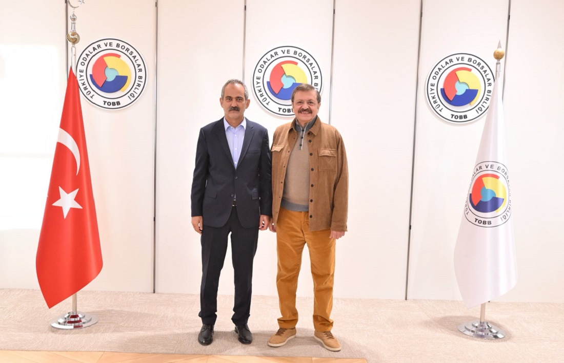 M. Rifat Hisarcıklıoğlu, President of the Union of Chambers and Commodity Exchanges of Türkiye (TOBB), met with Mahmut Özer, former Minister of National Education and Member of Parliament for Ordu. Hisarcıklıoğlu thanked Özer for his visit.