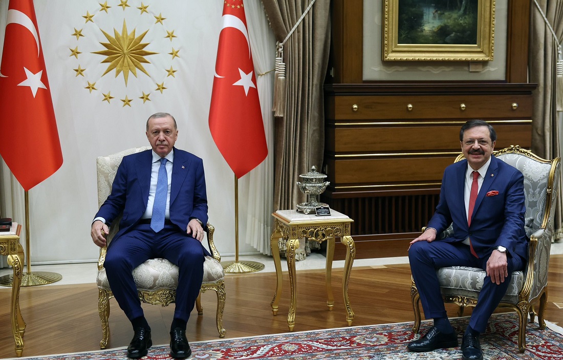 President Recep Tayyip Erdoğan received M. Rifat Hisarcıklıoğlu, President of the Union of Chambers and Commodity Exchanges of Türkiye (TOBB), at his office. During the visit at the Presidential Complex, TOBB President Hisarcıklıoğlu conveyed the issues on the business world's agenda to President Erdoğan.